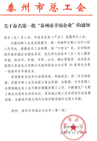 近日,xpj国际,xpj官网登录入口集团荣获泰州市总工会授予的“泰州市幸福企业”荣誉称号。