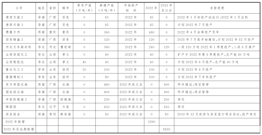 表3 2017~2023年及远期国内氧化铝新建产能列表