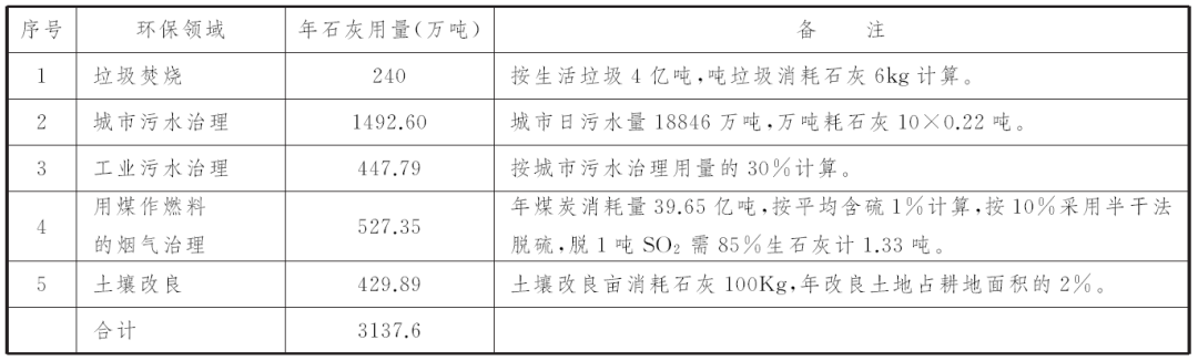表5 部分环保领域石灰消耗量估算