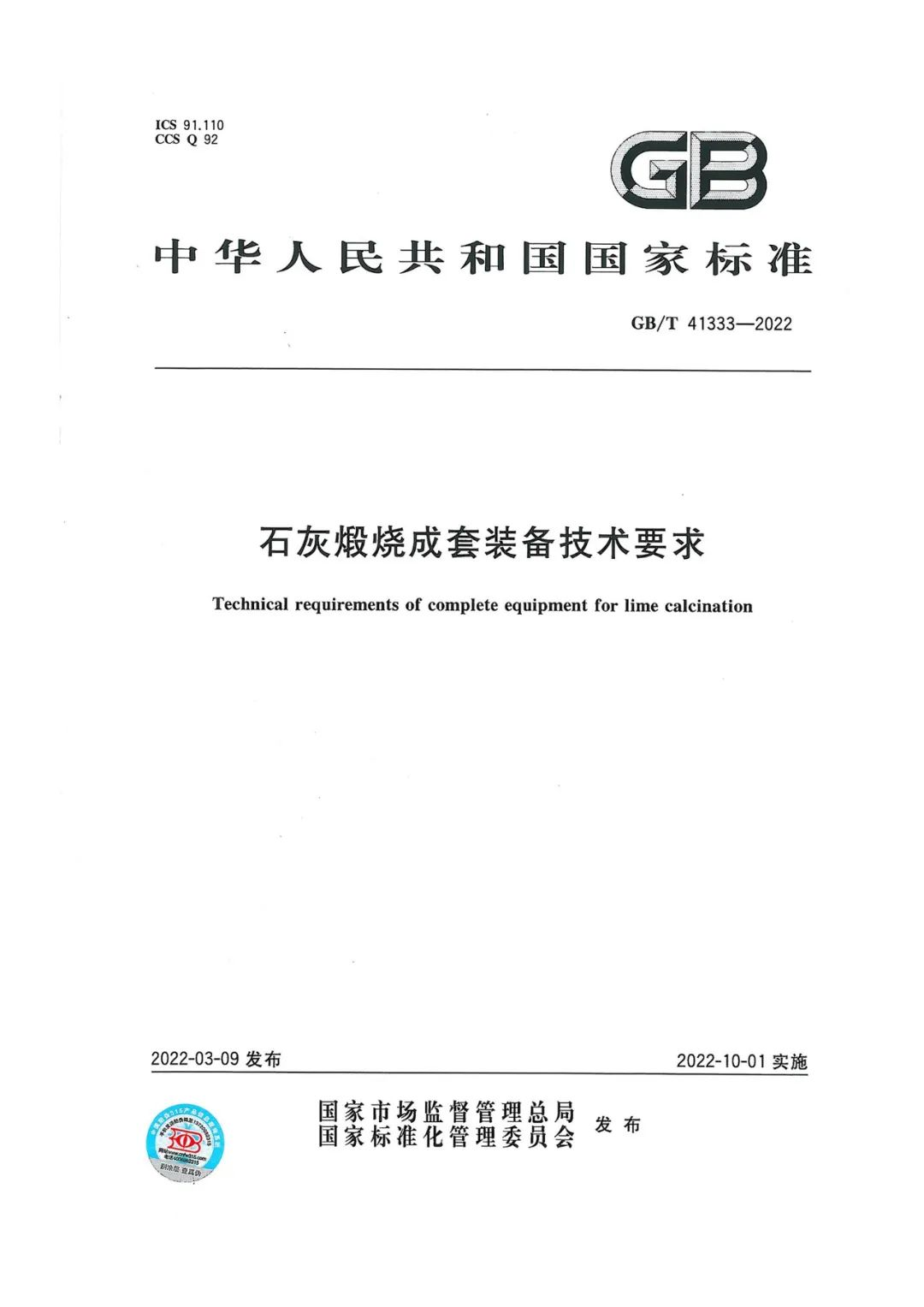 石灰行业《石灰煅烧成套装备技术要求》(GB/T 41333-2022)最新标准于2022年3月9日正式发布,并将于2022年10月1日起实施。
