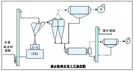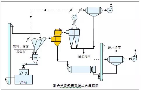 此工艺运用于VPM立磨功率与球磨机功率比值大于0.5的场合,该系统主要优点是系统产量高(增产100%以上),单位电耗低。
