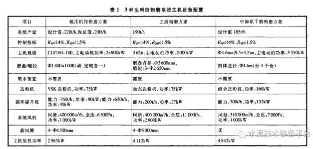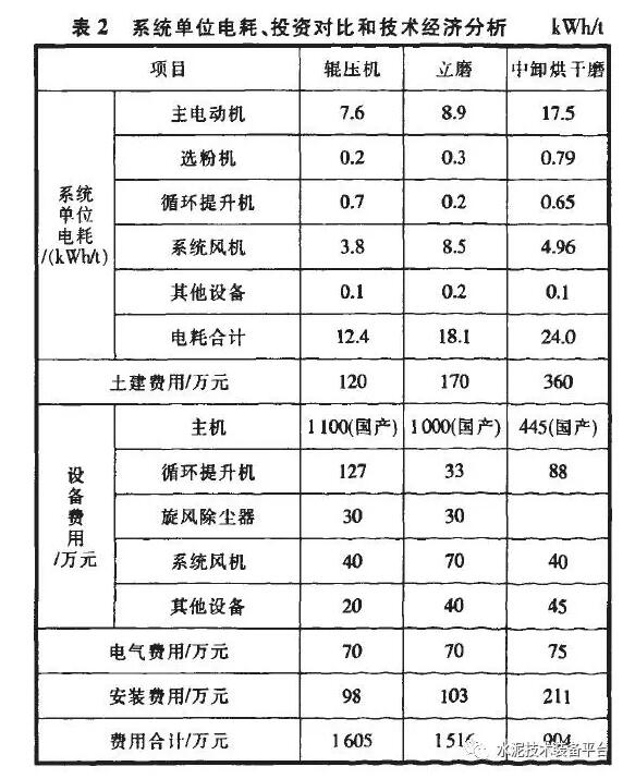 3种生料终粉磨系统主机设备对比见表1,单位电耗、投资及技术经济分析见表2。